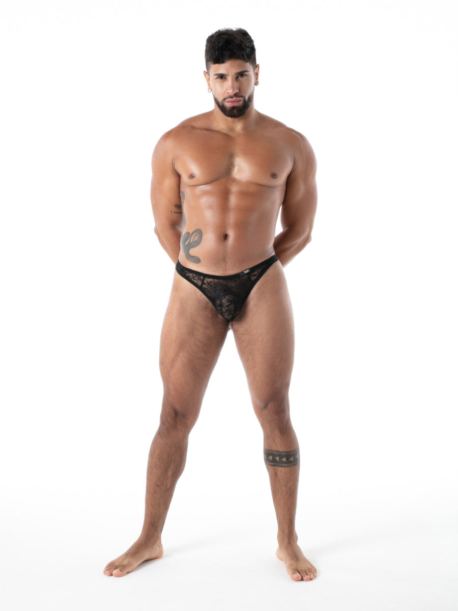 Der FLUID Spitzen G-Thong von TOF Paris vereint leichte Transparenz mit maskulinem Stil. Weiche, elastische Spitze ohne Frontnaht sorgt für eine markante Form und angenehmen Sitz. Das italienische Bundband mit eingewebtem TOF Paris Logo rundet den luxuriösen Look ab – Made in Paris.