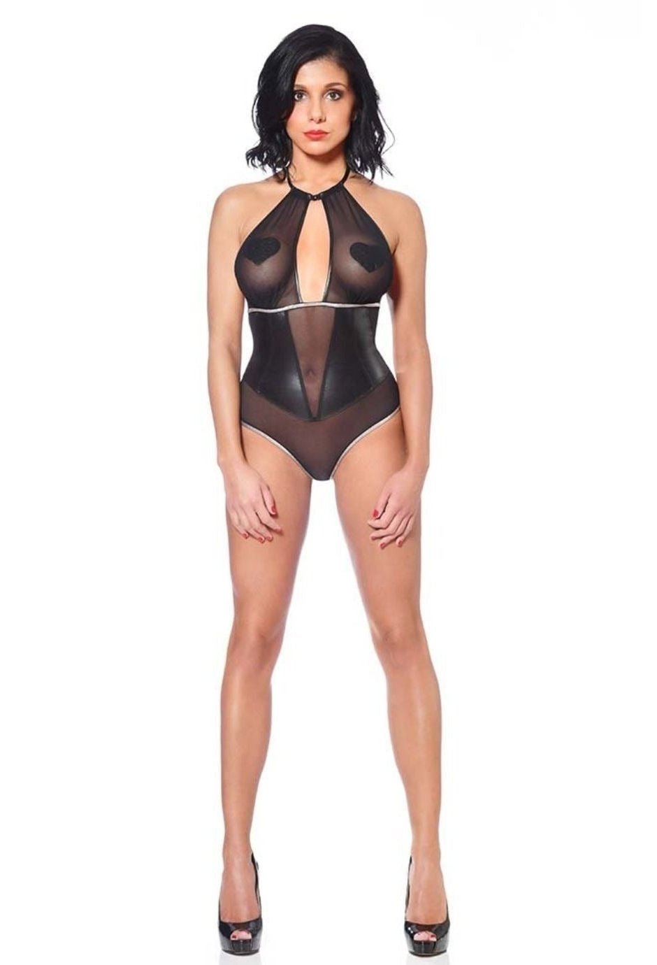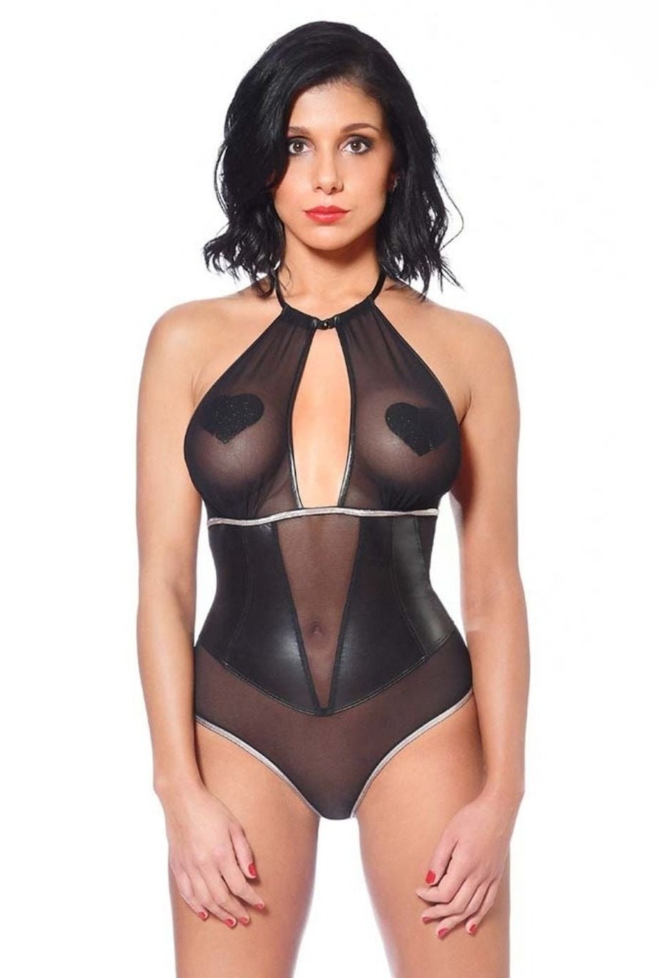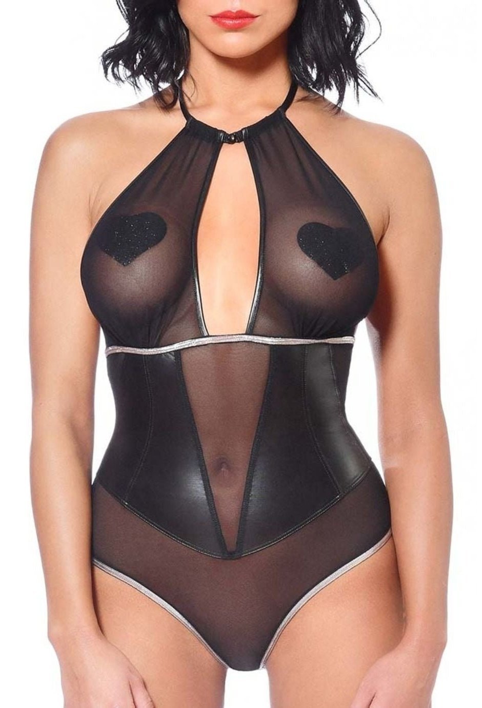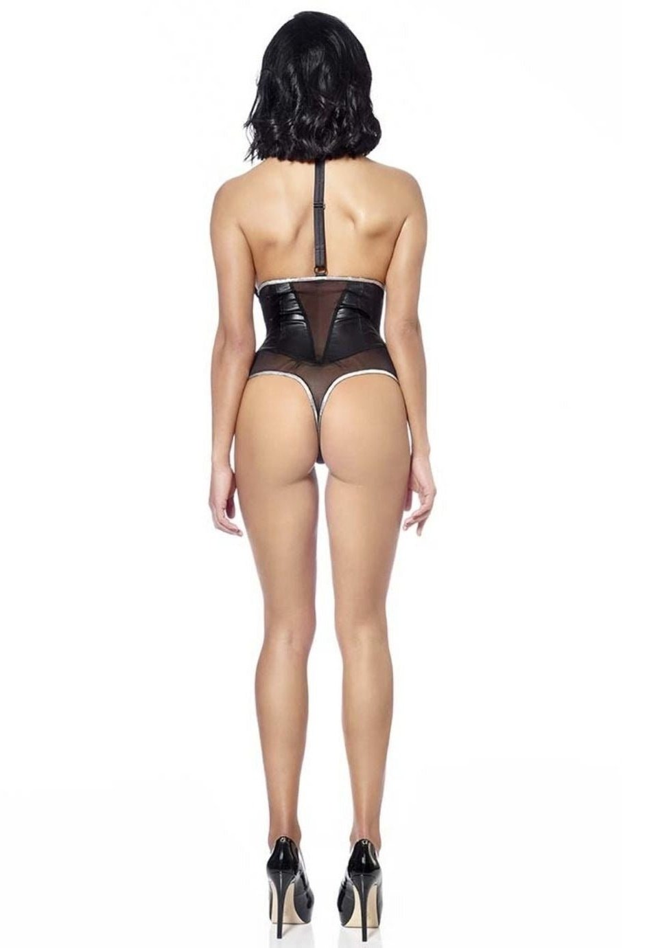 Gefertigt aus feinem Mesh mit einem angedeuteten Taillenmieder aus hochwertigem Wetlook und silberenen Umrandungen.