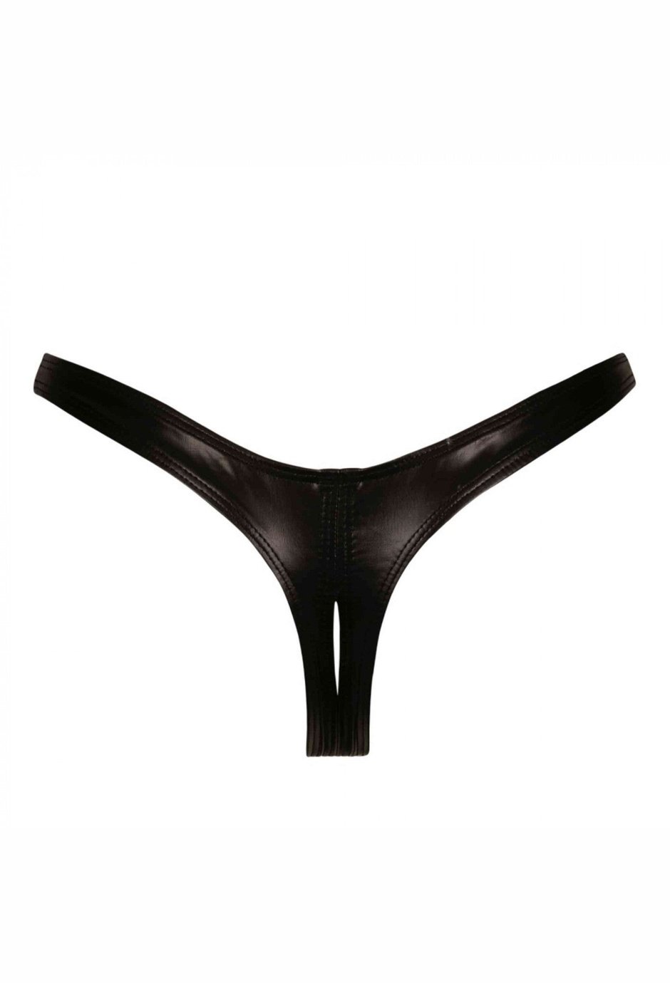 Die elegante Farbe Schwarz unterstreicht die erotische Ausstrahlung dieses Strings und lässt Sie unwiderstehlich wirken. Fühlen Sie sich selbstbewusst und sexy, während Sie diesen verführerischen Wetlook String tragen.