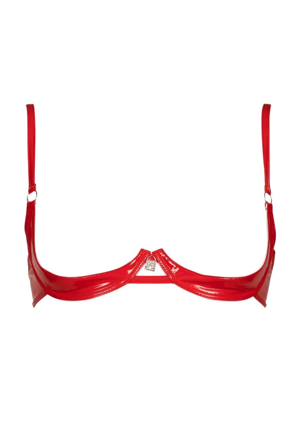 Der BH ist aus hochwertigem, dehnbarem Material gefertigt, das sich angenehm an den Körper schmiegt und eine hervorragende Passform bietet. Ein kleines Zierschloss mit Strasssteinen verleiht diesem BH einen zusätzlichen Glanz, während es perfekt zum passenden ANNABELLE Lack-String mit Zierschlüssel passt.