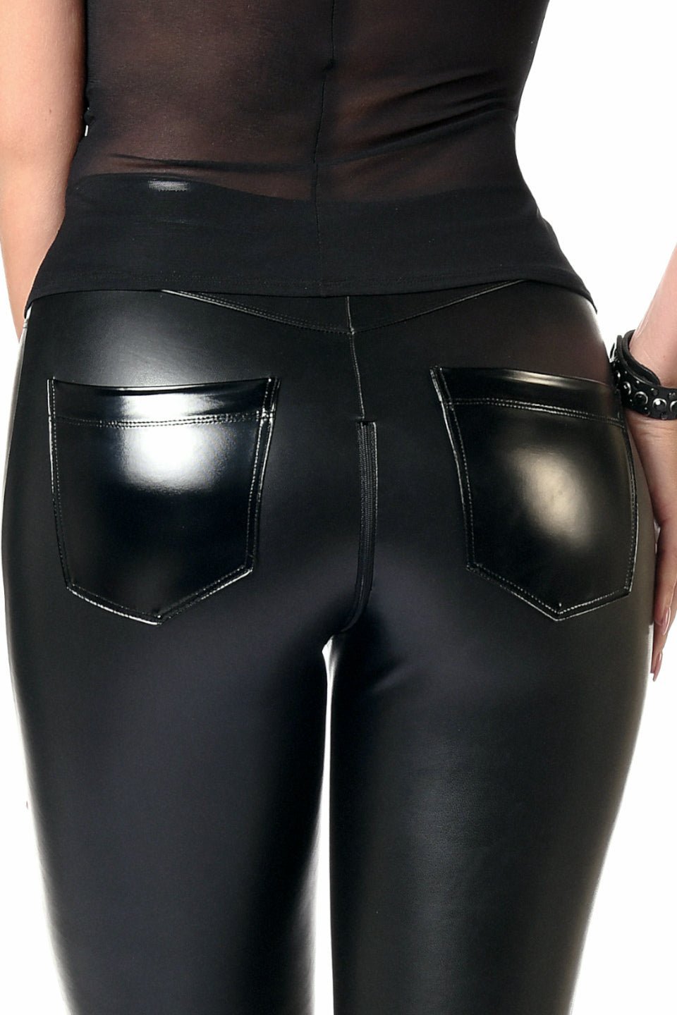 - Design: Matt glänzendes Lederimitat mit Kontrastdetails aus glänzendem Lack an Taschen und Bund. Die angedeuteten Vordertaschen fügen eine optische Tiefe hinzu, während die funktionellen Gesäßtaschen praktisch und stilvoll sind.