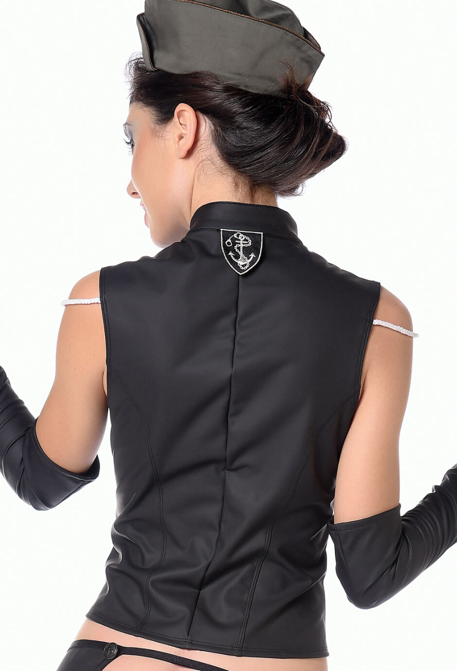 Es wird vorne mit schwarzen, patentierten Druckknöpfen geschlossen. Wunderschöne, schillernde weiße Kordel-Details drapieren auf die Schultern. Ein marineblaues Wappen auf der Rückseite gibt den letzten Schliff.