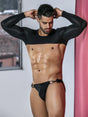 Der Black Elegant Total Look von R4VAGE by C4M vereint klare Linien mit einer reduzierten, selbstbewussten Ästhetik. Das langärmlige Crop-Top setzt Schultern und Arme markant in Szene, während der minimalistische Slip mit seitlichen Metallringen einen kontrollierten, erotischen Akzent setzt. Ein Look, der Stärke ausstrahlt und bewusst provoziert.