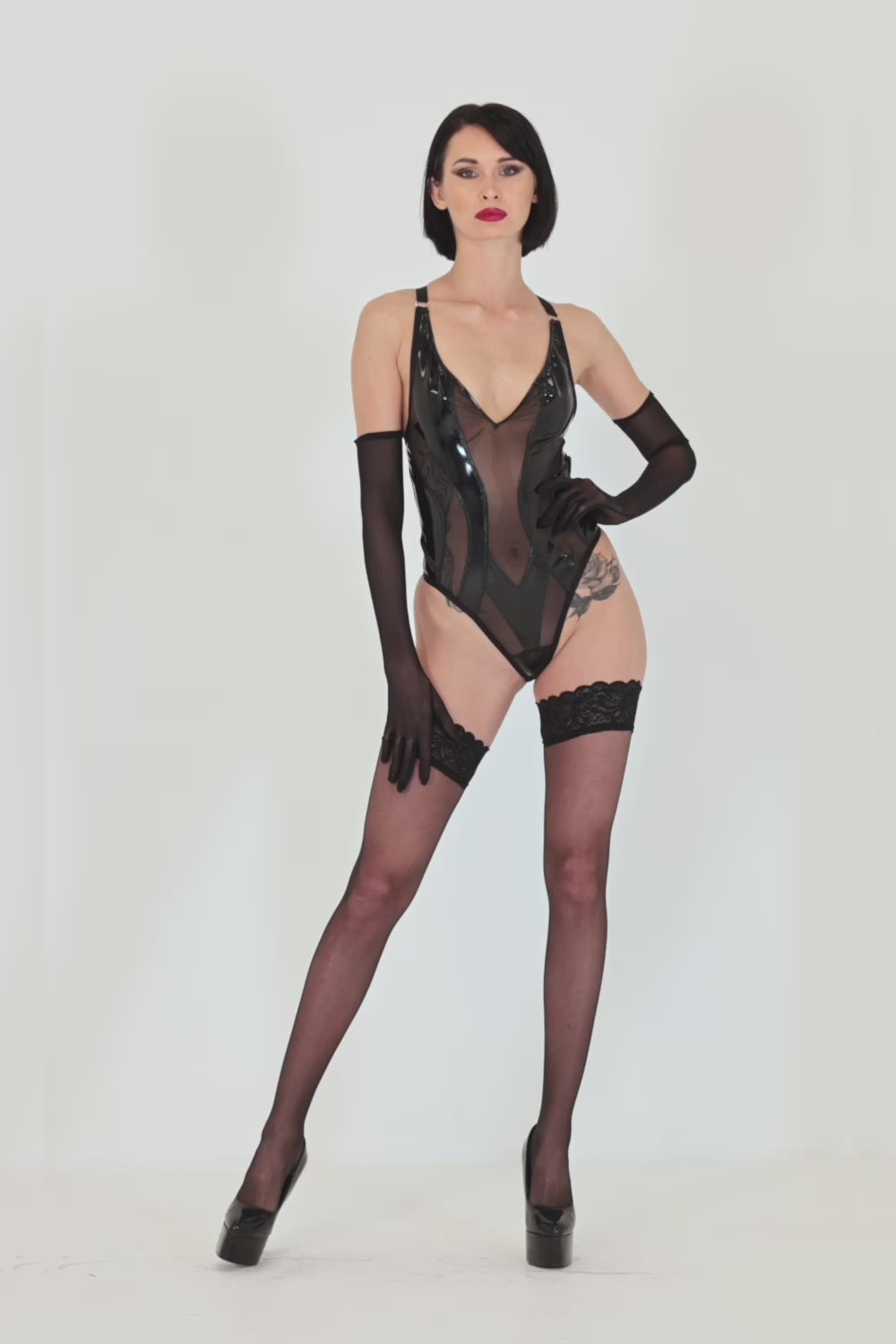 Ein tiefer V-Ausschnitt, eingefasst in glänzenden Lack, lenkt den Blick verführerisch auf das Dekolleté, während seitliche Einsätze aus feiner Netzstruktur eine subtile Transparenz schaffen. Die verstellbaren Träger kreuzen sich am Rücken zu einem minimalistischen, offenen Design, das Deine Linien elegant unterstreicht.