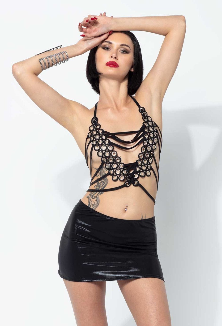 - Design: Black Lycra miniskirt with extravagant straps and eyelets on the back