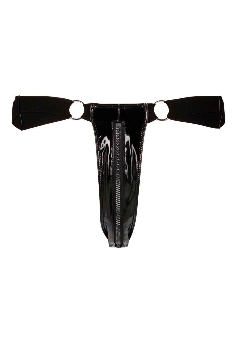 This sexy thong, made from shiny black vinyl, shows good taste and ensures exciting moments. The stretchy straps on the waist and hips mean it fits perfectly to your body contours, while the silver rings on the back offer additional charm.