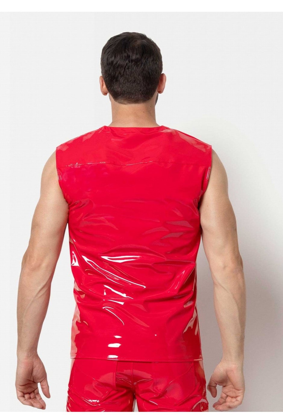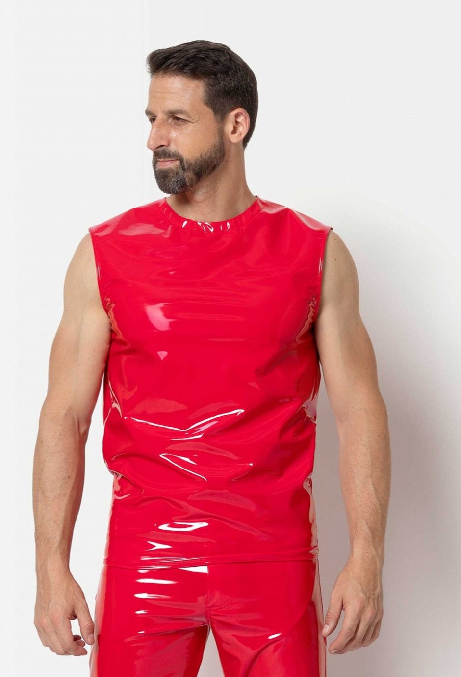 The sleeveless men's shirt "Soren" by Patrice Catanzaro offers an impressive combination of style and comfort. Made from a high-quality stretch vinyl, it comes in a bright red that is guaranteed to attract attention. The round neckline and the slightly figure-hugging cut ensure a flattering fit, while the quilted seam at the back over the shoulders adds an additional stylistic touch.