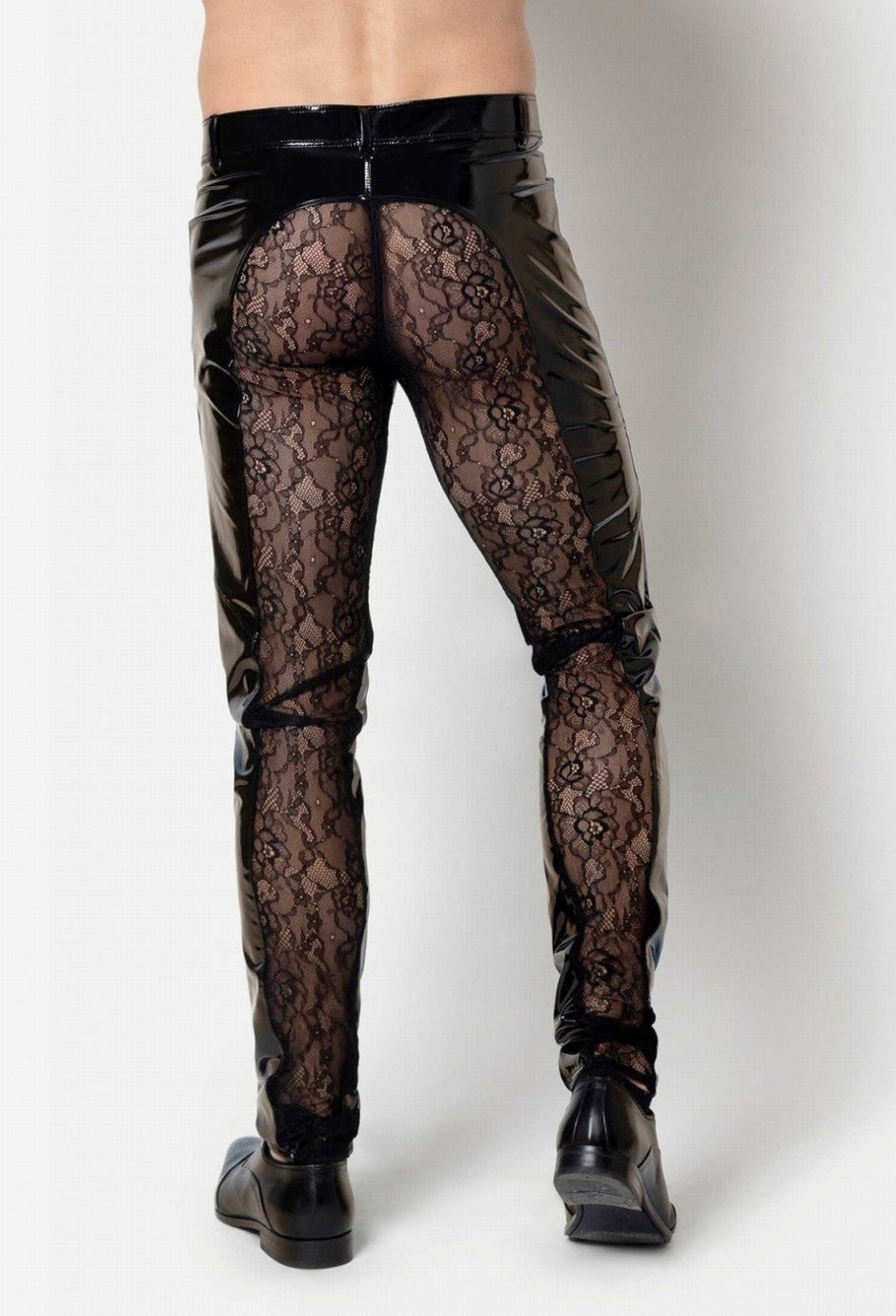 Excitement and style come together in the elegant party pants by Patrice Catanzaro, designed for the modern man who wants to shine at every kinky fetish party. These pants combine black stretch vinyl with a semi-transparent stretch lace insert on the back, which particularly emphasizes the buttocks and creates an attractive silhouette.