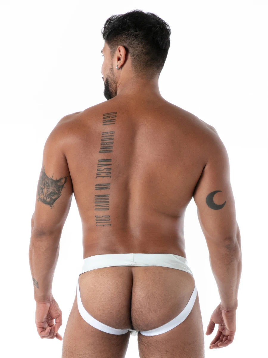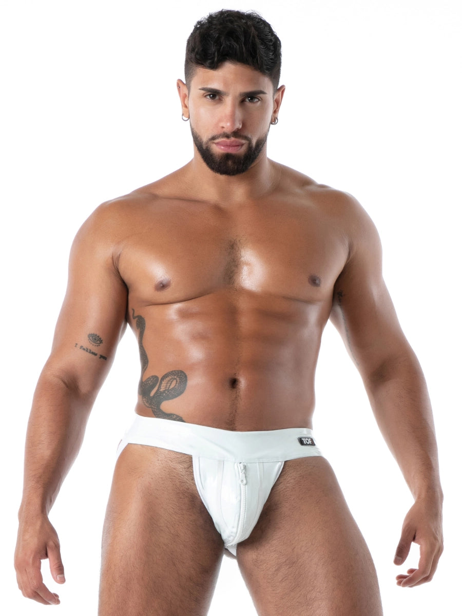 Die offene Rückseite sorgt für maximale Freiheit und Wirkung, während der integrierte Reissverschluss im Frontbereich einen markanten, funktionalen Akzent setzt. In strahlendem Weiss wirkt der Jock besonders clean, sinnlich und stilvoll – ideal für Clubnächte, exklusive Events oder als ausdrucksstarkes Fetish-Statement.