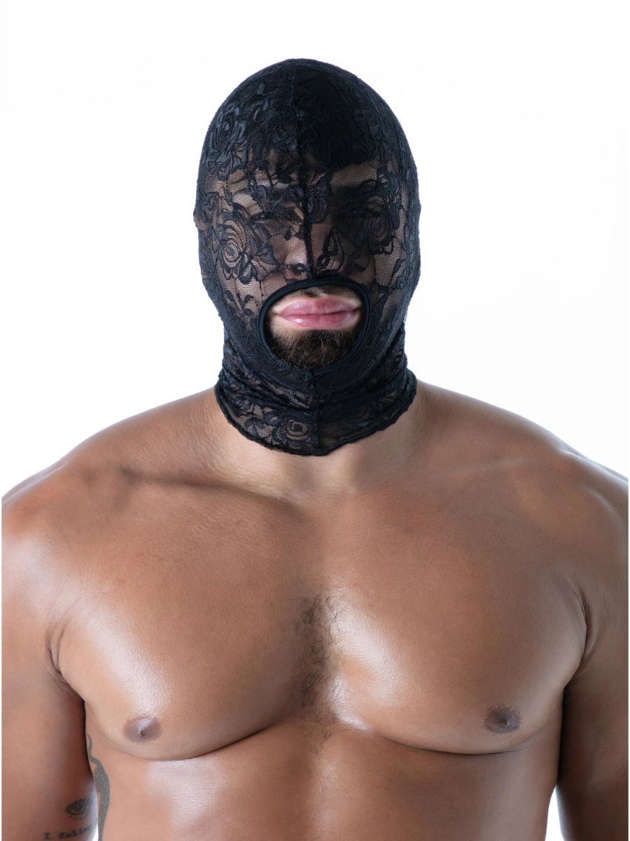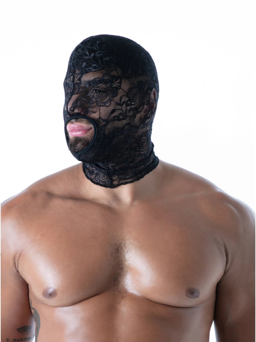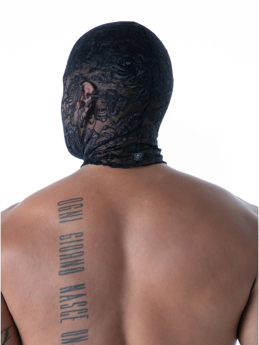 FLUID Spitzen-Kapuze mit offenem Mund – aus weicher, durchbrochener Spitze gefertigt, verdeckt die Augen und lässt nur den Mund frei. Das florale Muster mit Bourdon-Finish verleiht der Kapuze eine edle Struktur, während das gewebte TOF Paris-Logo dezent am Hinterkopf angebracht ist. Designed und genäht in Paris.