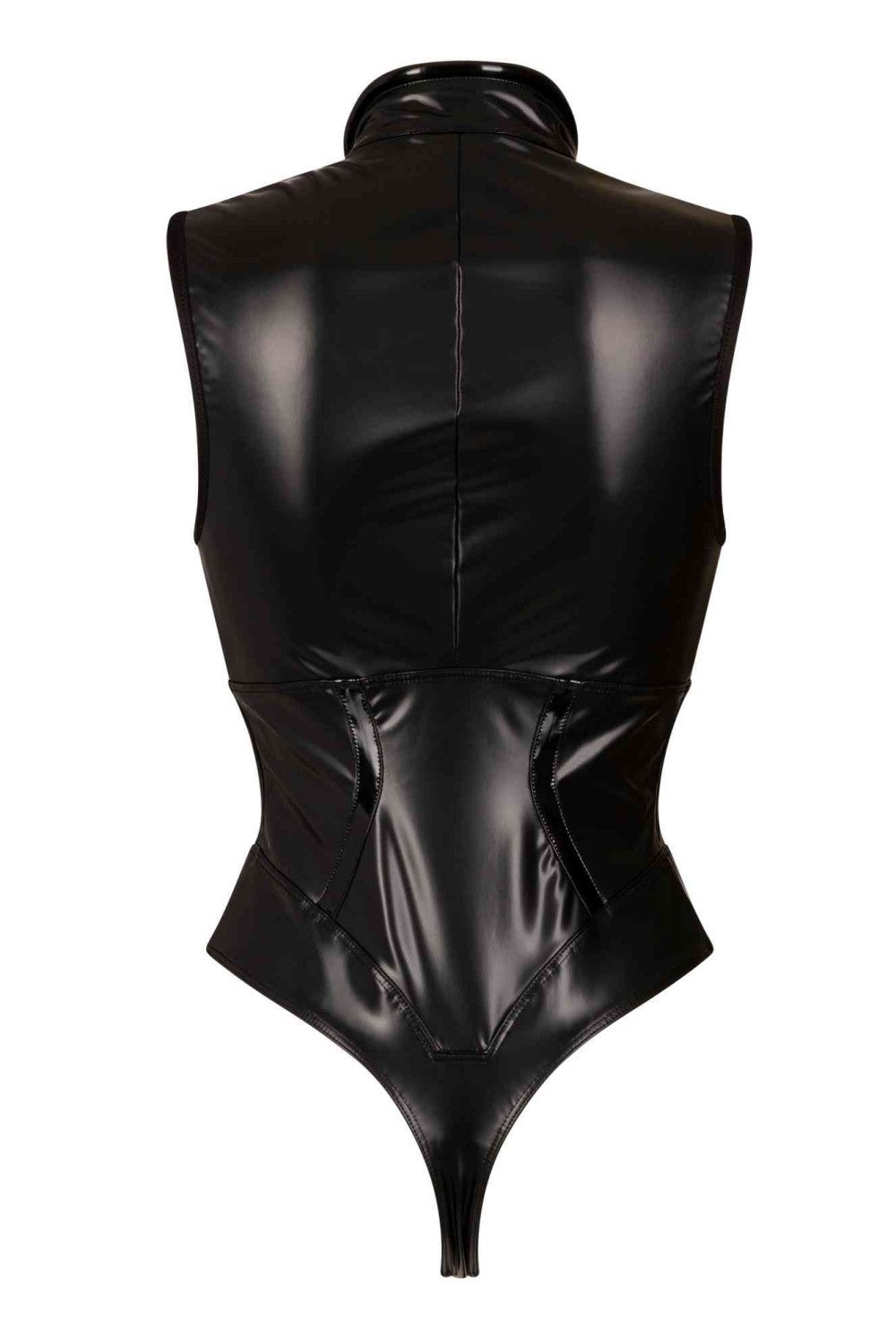 Ce body présente une combinaison unique de vinyle mat et brillant qui accentue les courbes du corps, tandis que le clip corporel à l'entrejambe et la fermeture éclair sur le ventre assurent fonctionnalité et confort. Un ornement argenté sur le col ajoute une touche élégante.