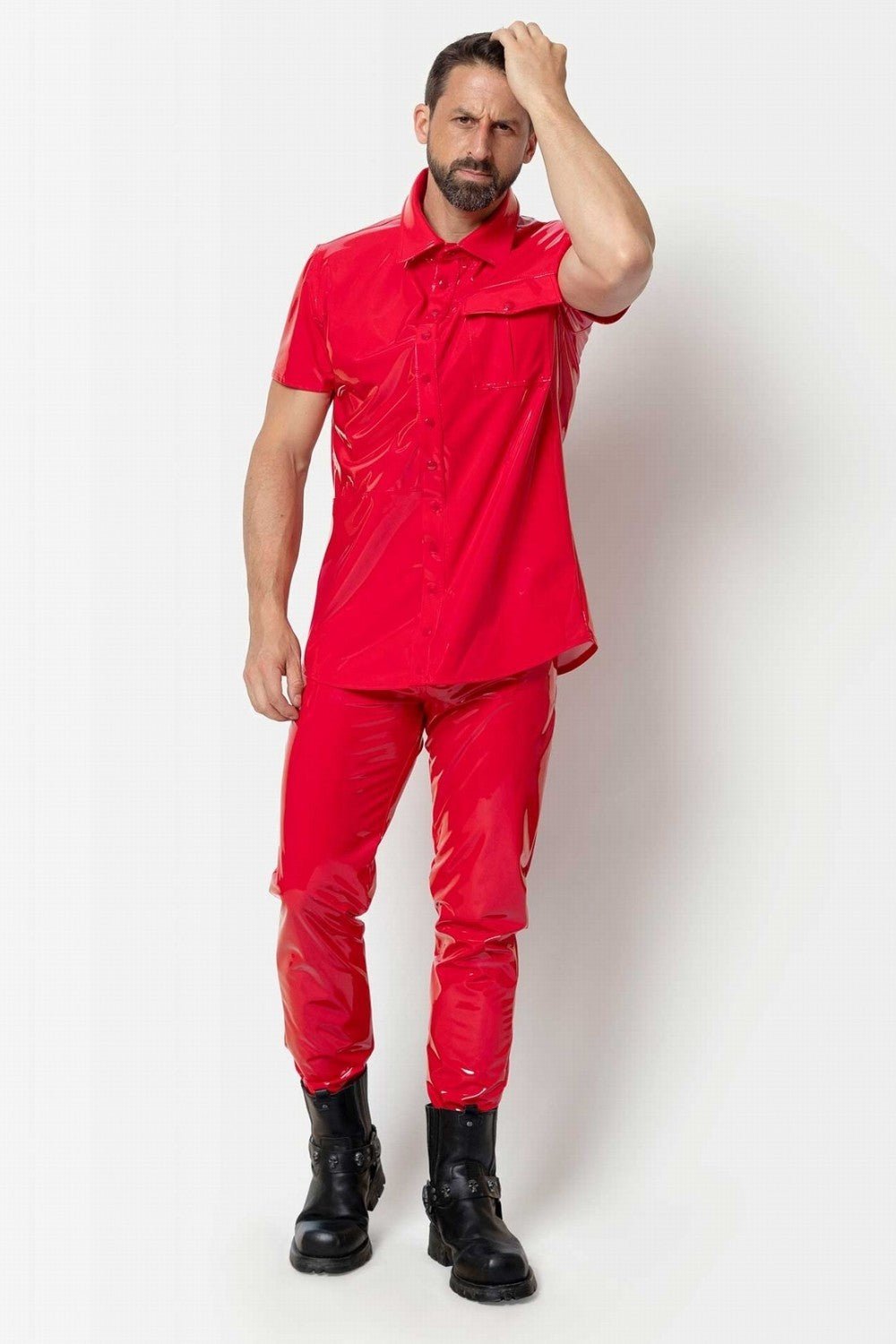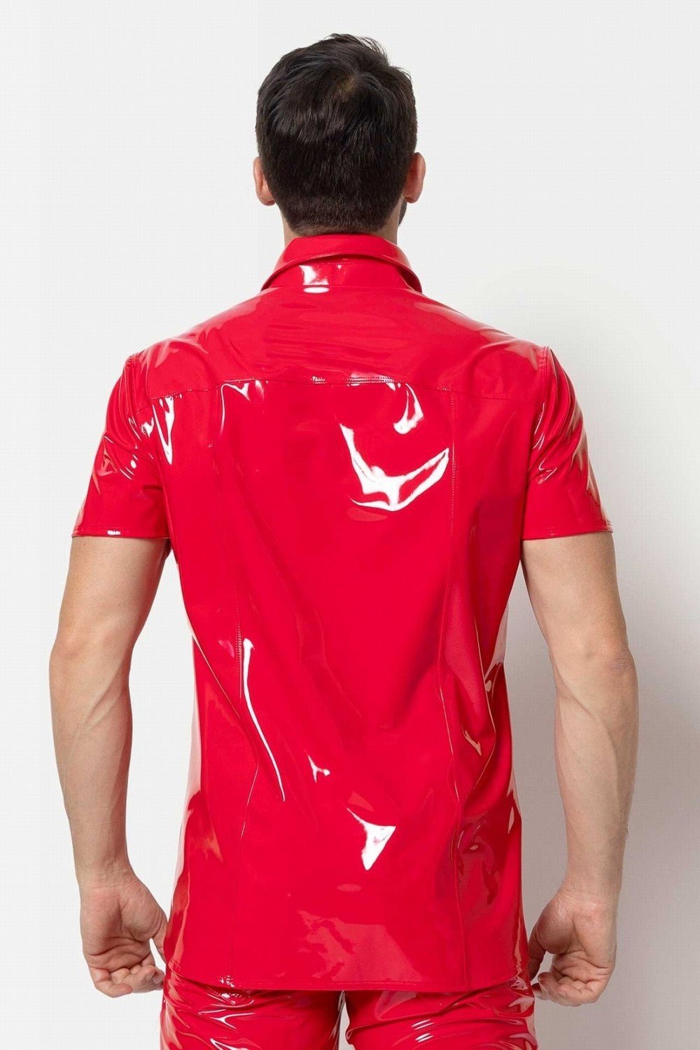 Cette chemise à manches courtes est confectionnée en tissu verni brillant et offre à la fois style et confort grâce à sa légère élasticité. Le col de chemise classique et la patte de boutonnage à boutons-pression anodisés noirs assurent un look moderne. Les coutures anatomiques matelassées dans le dos confèrent à la chemise un ajustement parfait et soulignent sa finition de haute qualité. Une poche poitrine ajoute un élément pratique. Le rouge vif fait de cette chemise un véritable accroche-regard pour toutes les occasions.