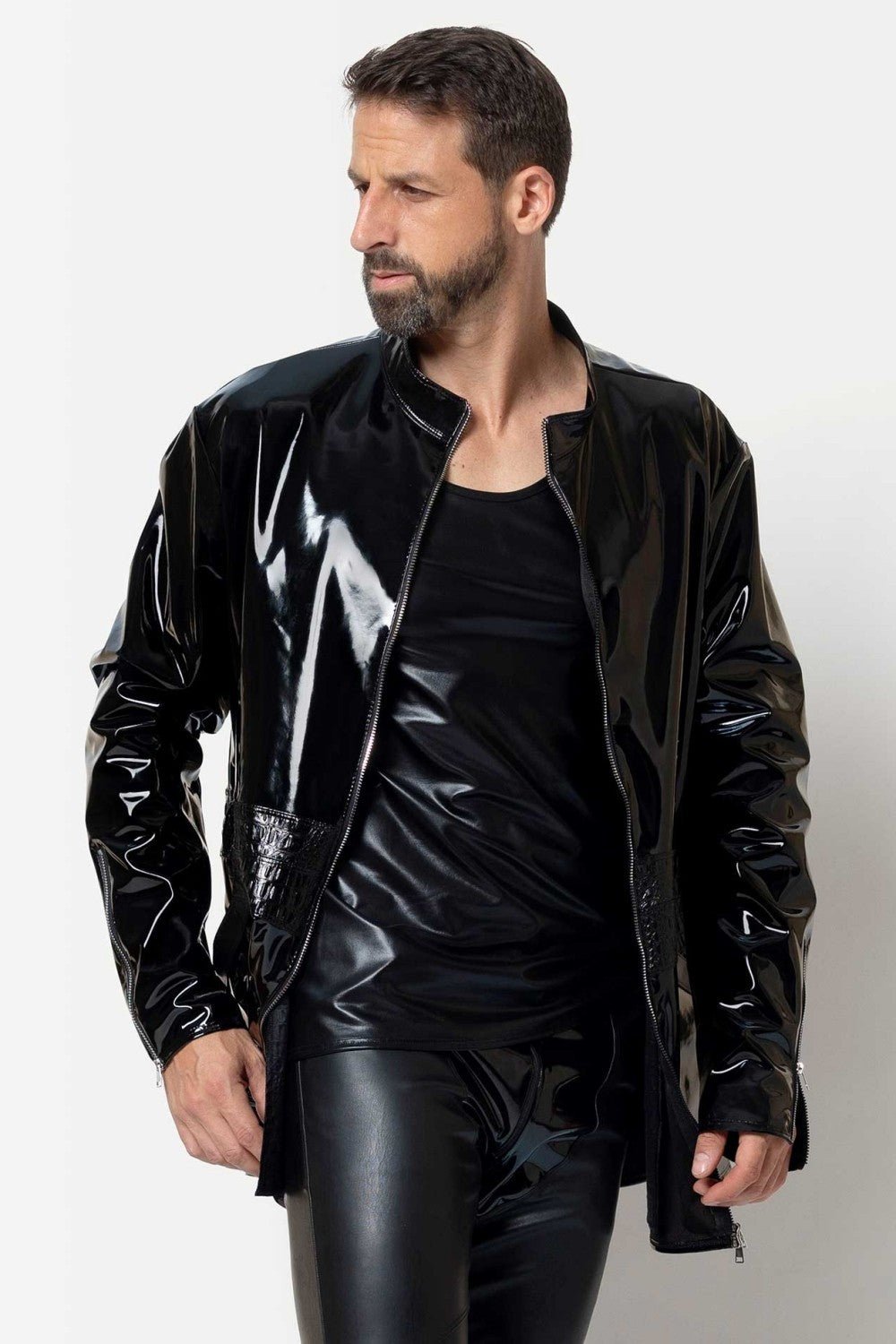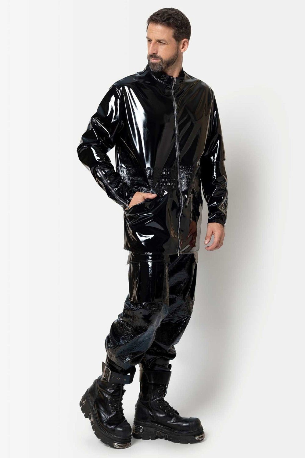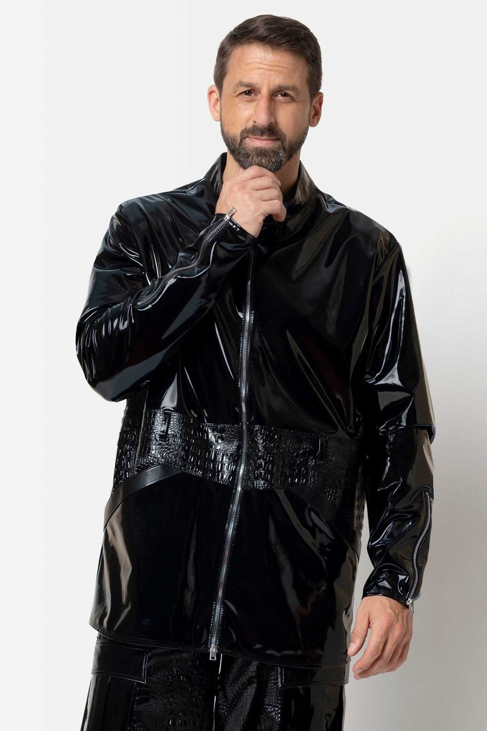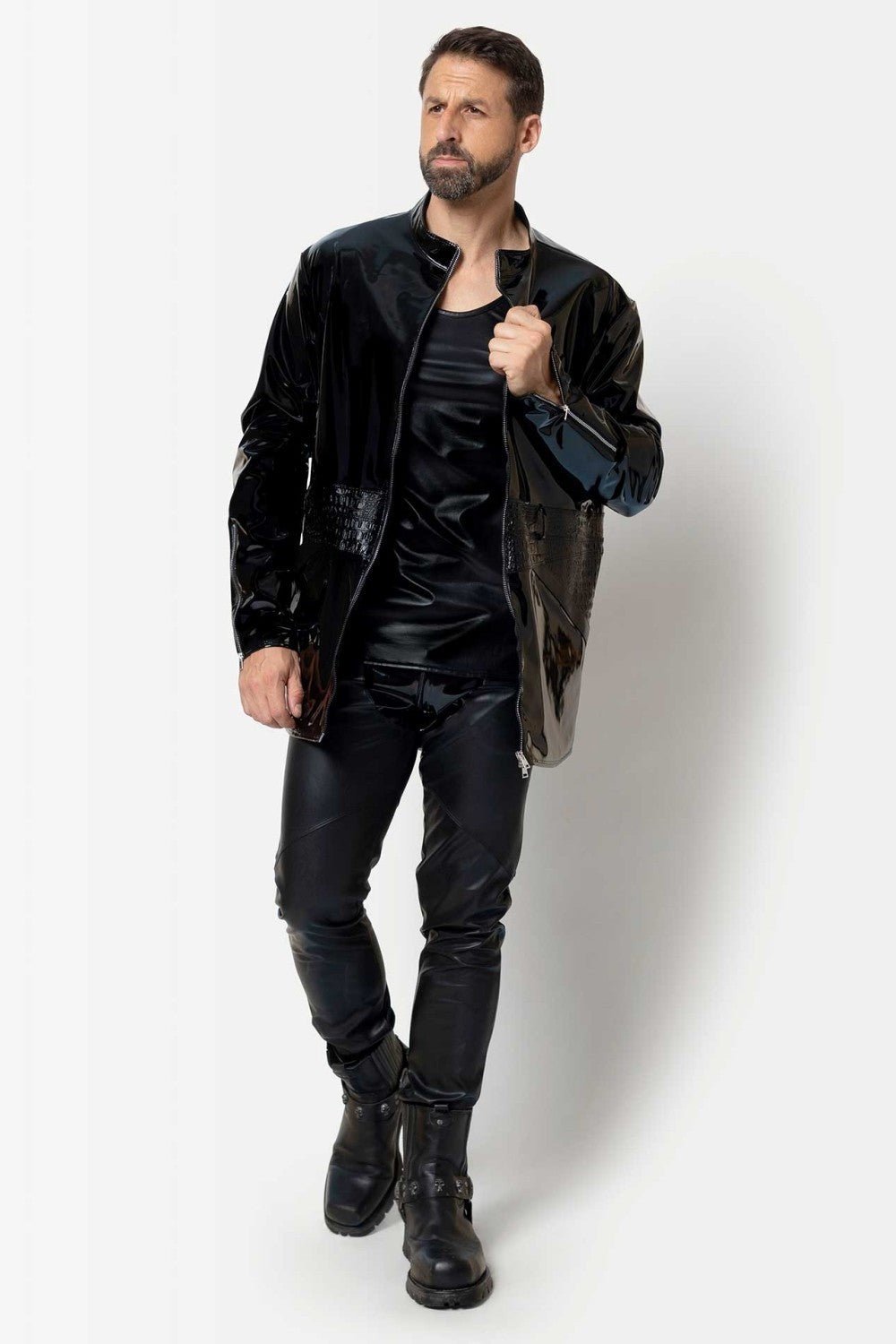 Découvrez un nouveau niveau de style et de fonctionnalité avec la longue veste noire vernie pour homme Holger de Patrice Catanzaro. Cette veste polyvalente en cuir verni extensible brillant est non seulement un accroche-regard à la mode, mais aussi pratique avec un total de quatre poches, dont deux poches latérales confortables et deux poches plaquées arrière en simili cuir de crocodile. La veste est dotée d'un col montant court et peut être portée comme une chemise ou comme un vêtement d'extérieur. La coupe décontractée est carrée et moulante, mais accentue la taille avec des empiècements élégants en cuir imitation crocodile.
