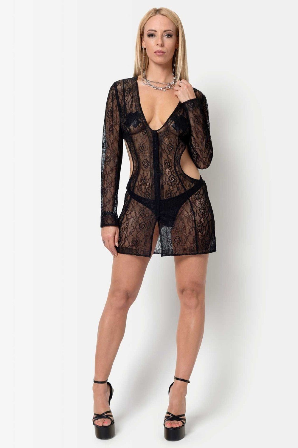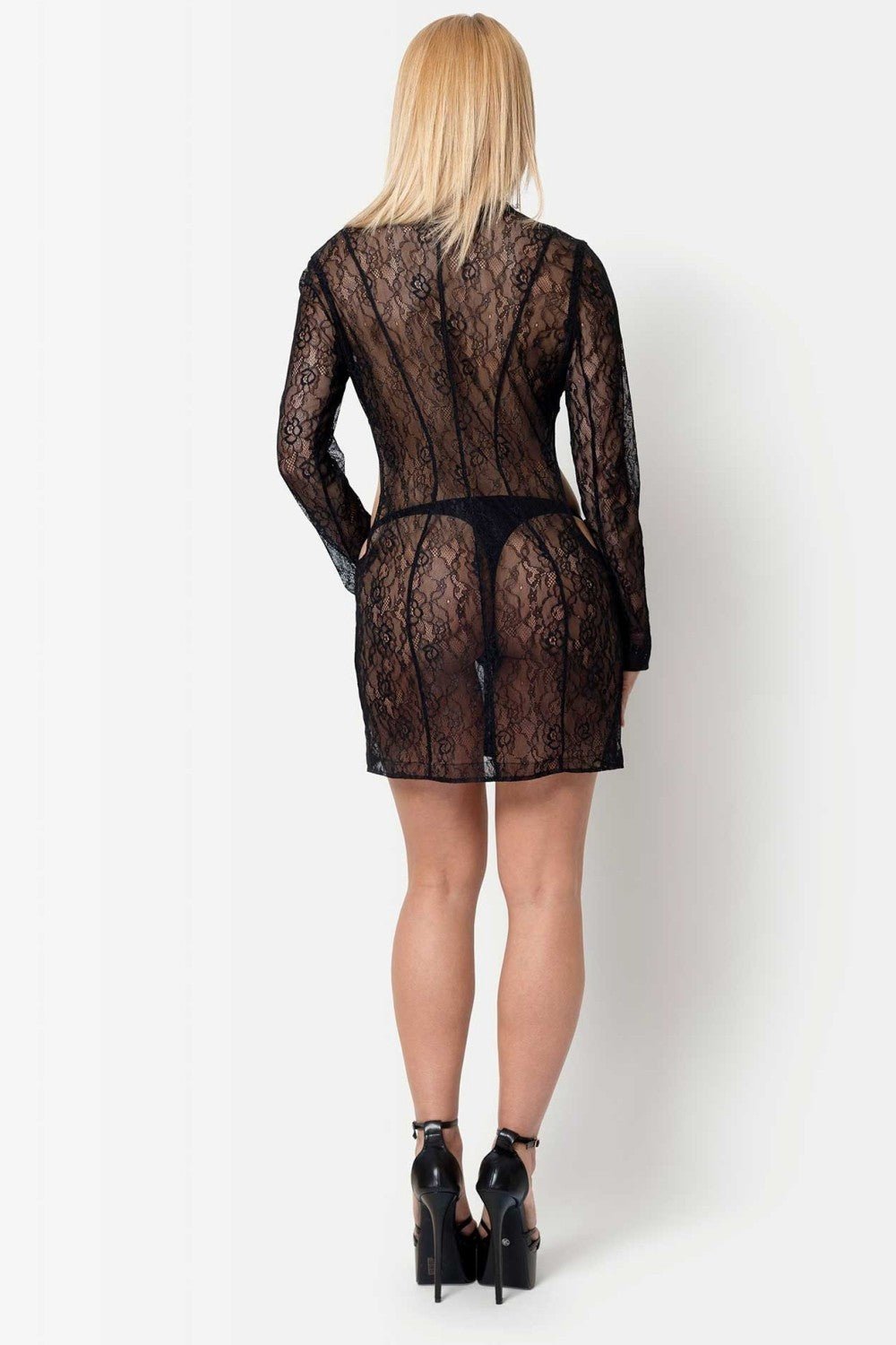 Contrairement à la maille conventionnelle, la dentelle utilisée offre une transparence élégante qui rend cette robe spéciale. Les manches longues et le décolleté profond renforcent son caractère séduisant.