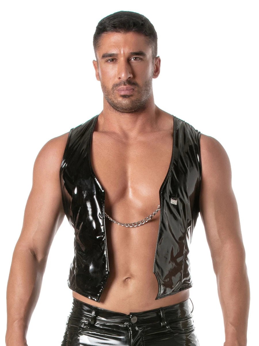 Con il Gilet a Catena in Vernice Nero scegli una lucentezza provocante con carattere da dichiarazione. La catena metallica integrata sul davanti rende questo gilet piĂč di un semplice capo d'abbigliamento â Ăš accessorio, espressione e feticcio in uno. Perfetto per le notti in discoteca, il palco o spettacoli privati.