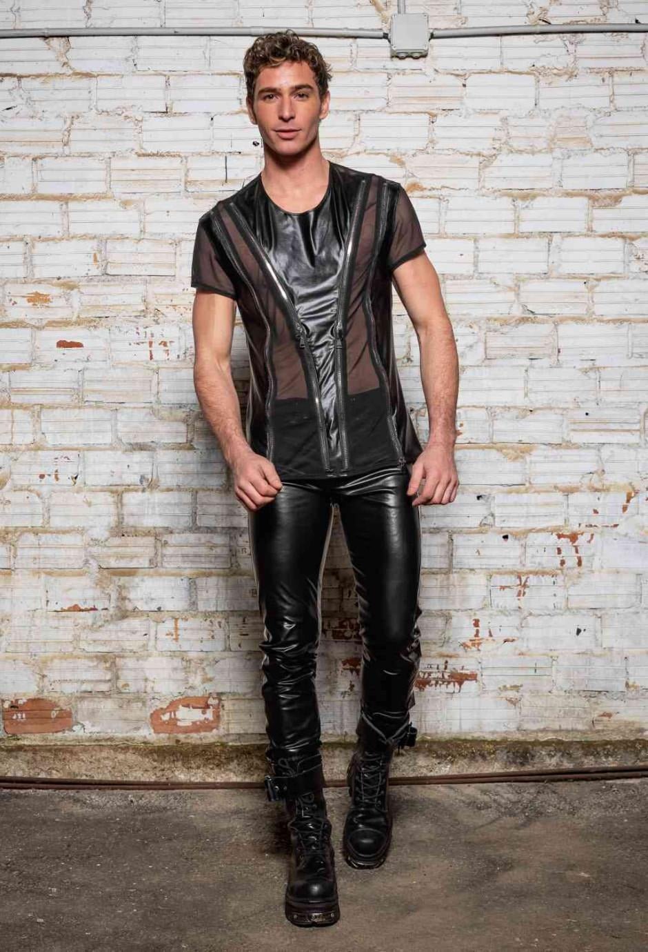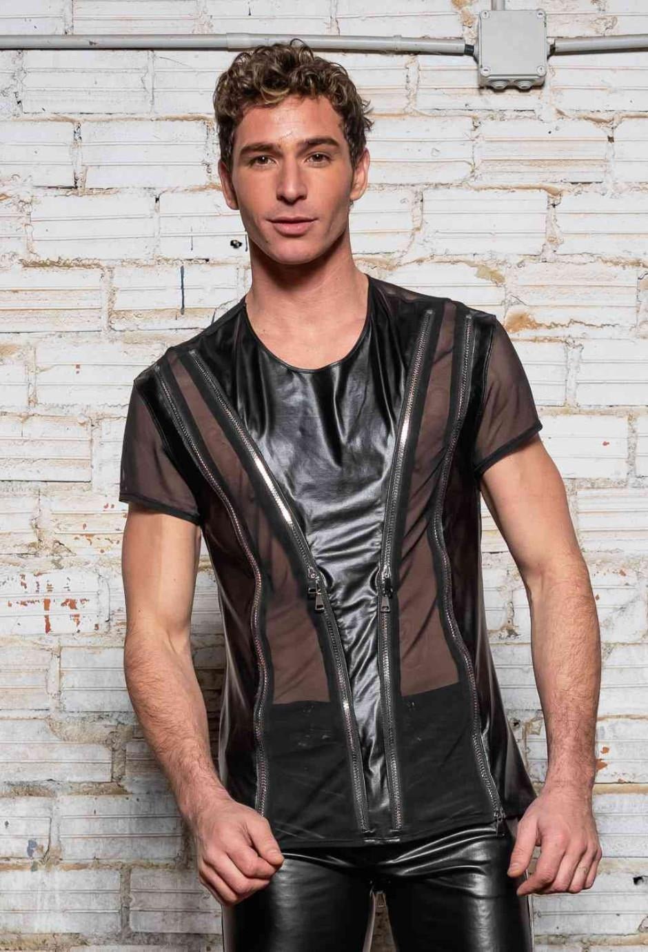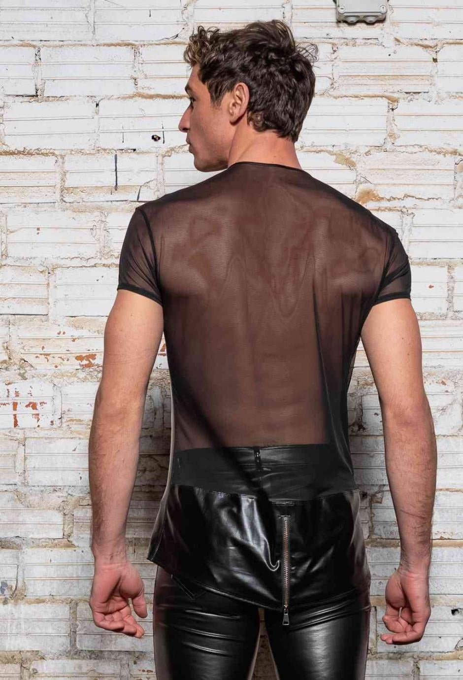 Fai una dichiarazione indimenticabile con la T-shirt Tobias della collezione uomo 6 di Patrice Catanzaro. Questa impressionante T-shirt da uomo combina tessuto a rete nero trasparente con materiale Wetlook e presenta un design accattivante con strisce verticali trasparenti sul davanti, che appare sia moderno che elegante.