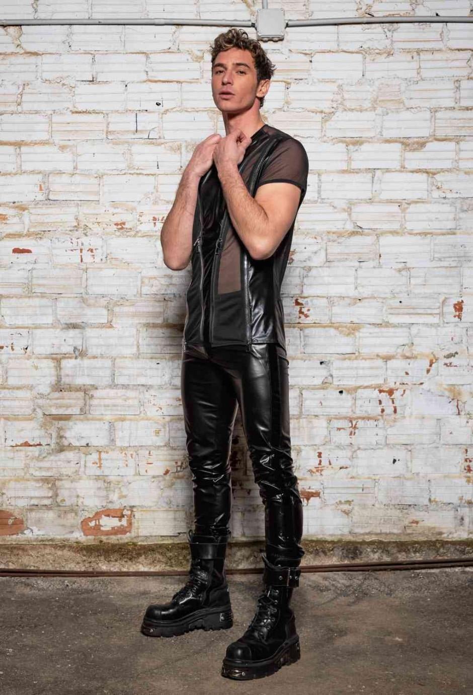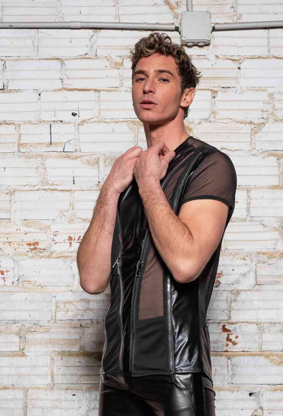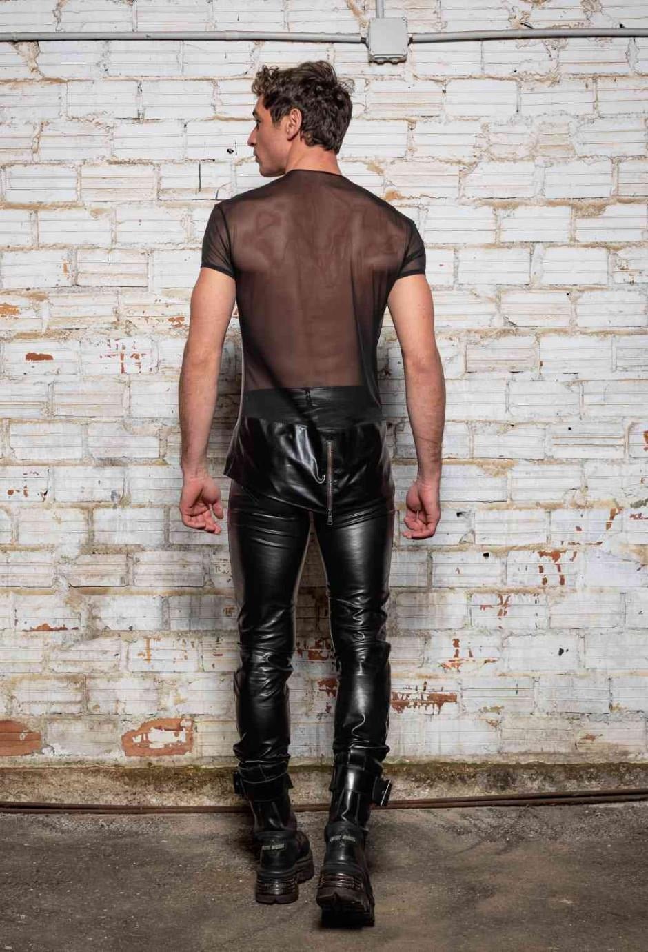 Fai una dichiarazione indimenticabile con la T-shirt Tobias della collezione uomo 6 di Patrice Catanzaro. Questa impressionante T-shirt da uomo combina tessuto a rete nero trasparente con materiale Wetlook e presenta un design accattivante con strisce verticali trasparenti sul davanti, che appare sia moderno che elegante.