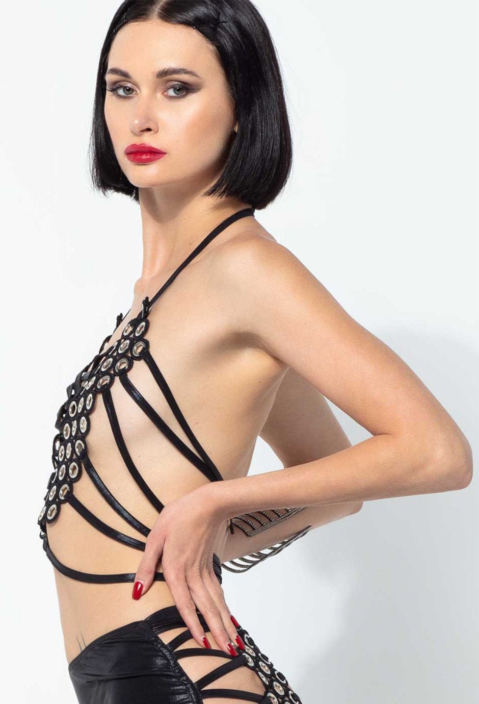 - Design: Top nero con cinturini in Lycra e anelli, scollo a V