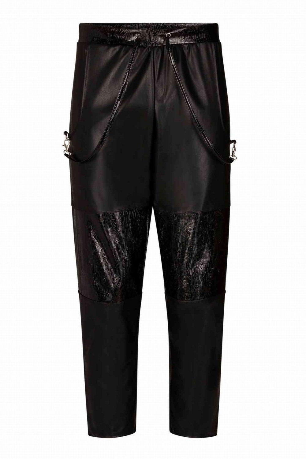Diese Hose im Jogging-Stil ist aus schwarzem Lederimitat mit strukturiertem Stretchlack gefertigt und garantiert eine bequeme Passform dank des elastischen Zugbunds. Der Karottenschnitt sorgt für eine trendige Silhouette, die oben weiter und nach unten schmal zuläuft. Perfekt für Schnürboots oder hohe Stiefel. Die Hose zeichnet sich durch praktische Seitentaschen und dekorative Karabiner an den Durchzugbändern aus, die einen lässigen Hingucker bieten.